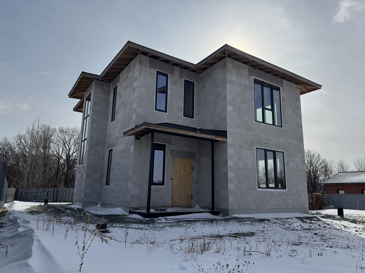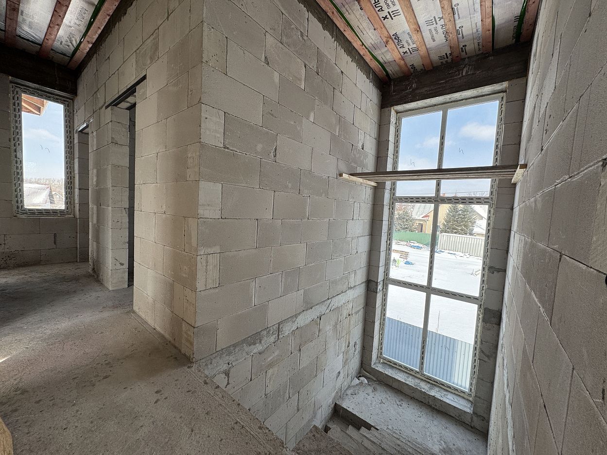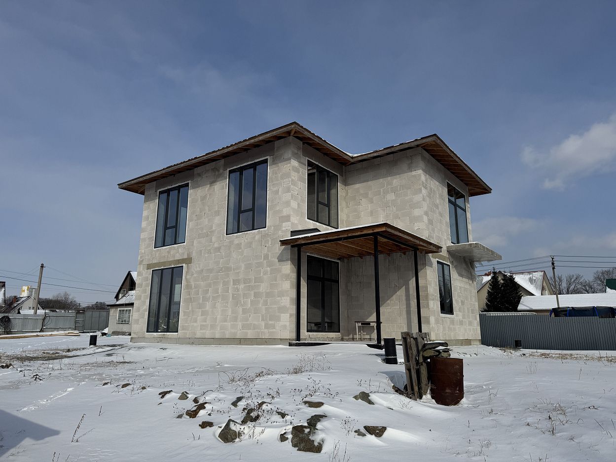 Дом выполнен на монолитной железобетонной фундаментной плите, стены выполнены из автоклавного газобетонного блока толщиной 400мм. Кровля смонтирована по деревянному балочному перекрытию, утепление минеральной ватой. Кровельное покрытие –гибкая черепица ТехноНИКОЛЬ Shinglas. Выполнен полный цикл земляных работ по подготовке пятна застройки: выполнено изъятие и вывоз плодородного слоя, пучинистый грунт заменен на непучинистый, устроена дренажная система.
