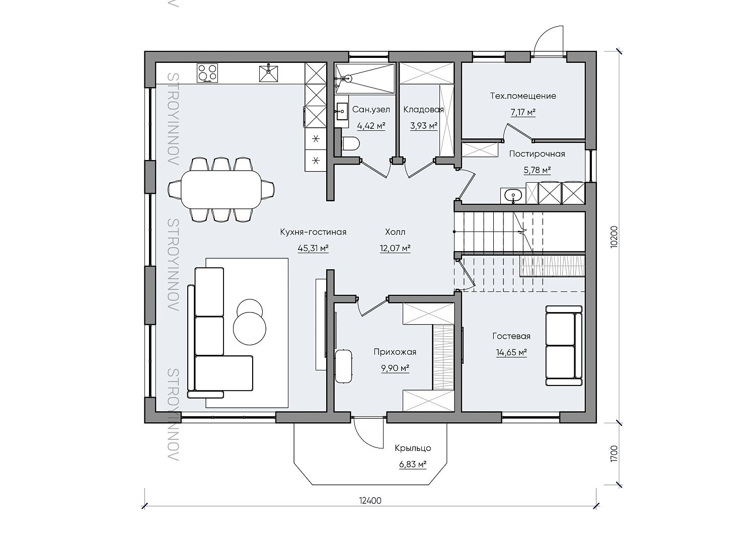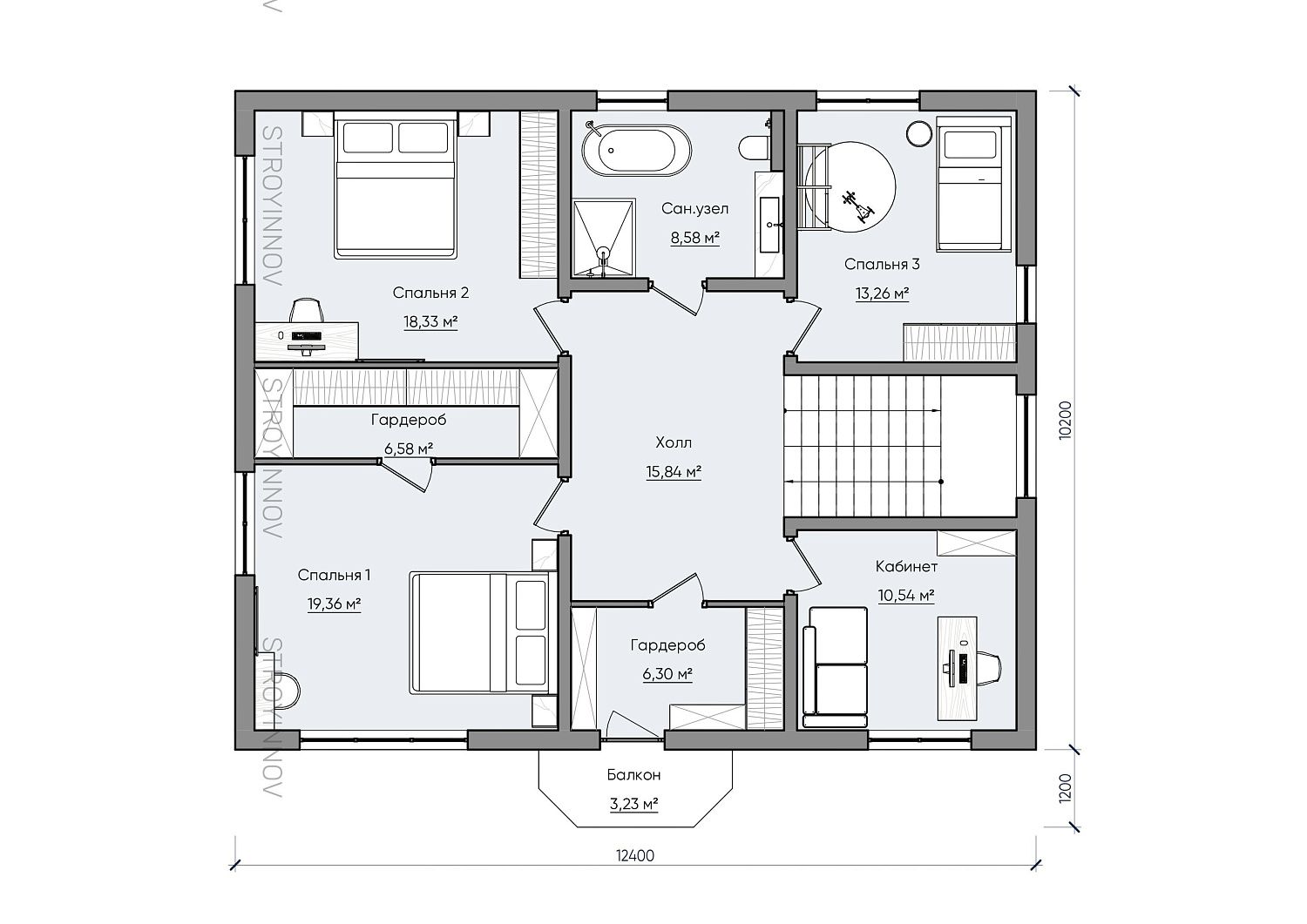 - Габариты дома - 12,4 х 10,2 м