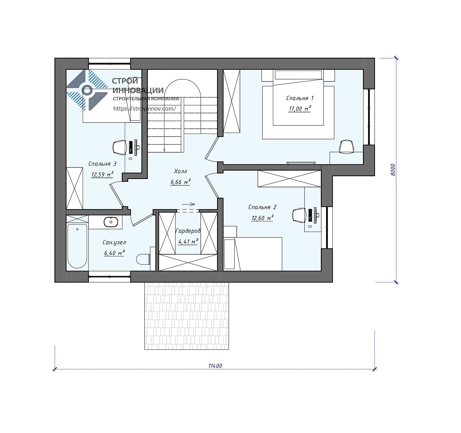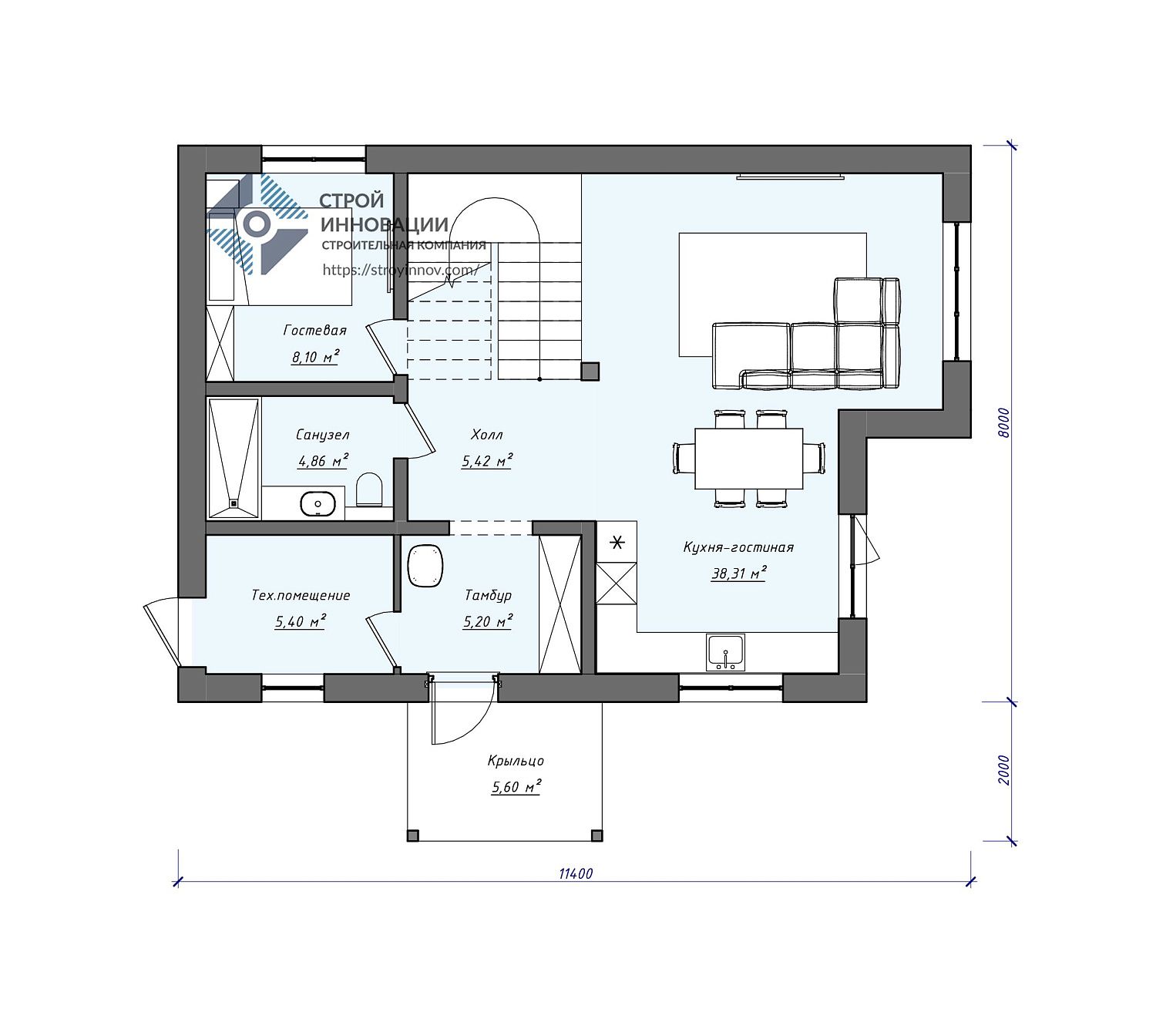 - Габариты дома - 11,4 х 8 м