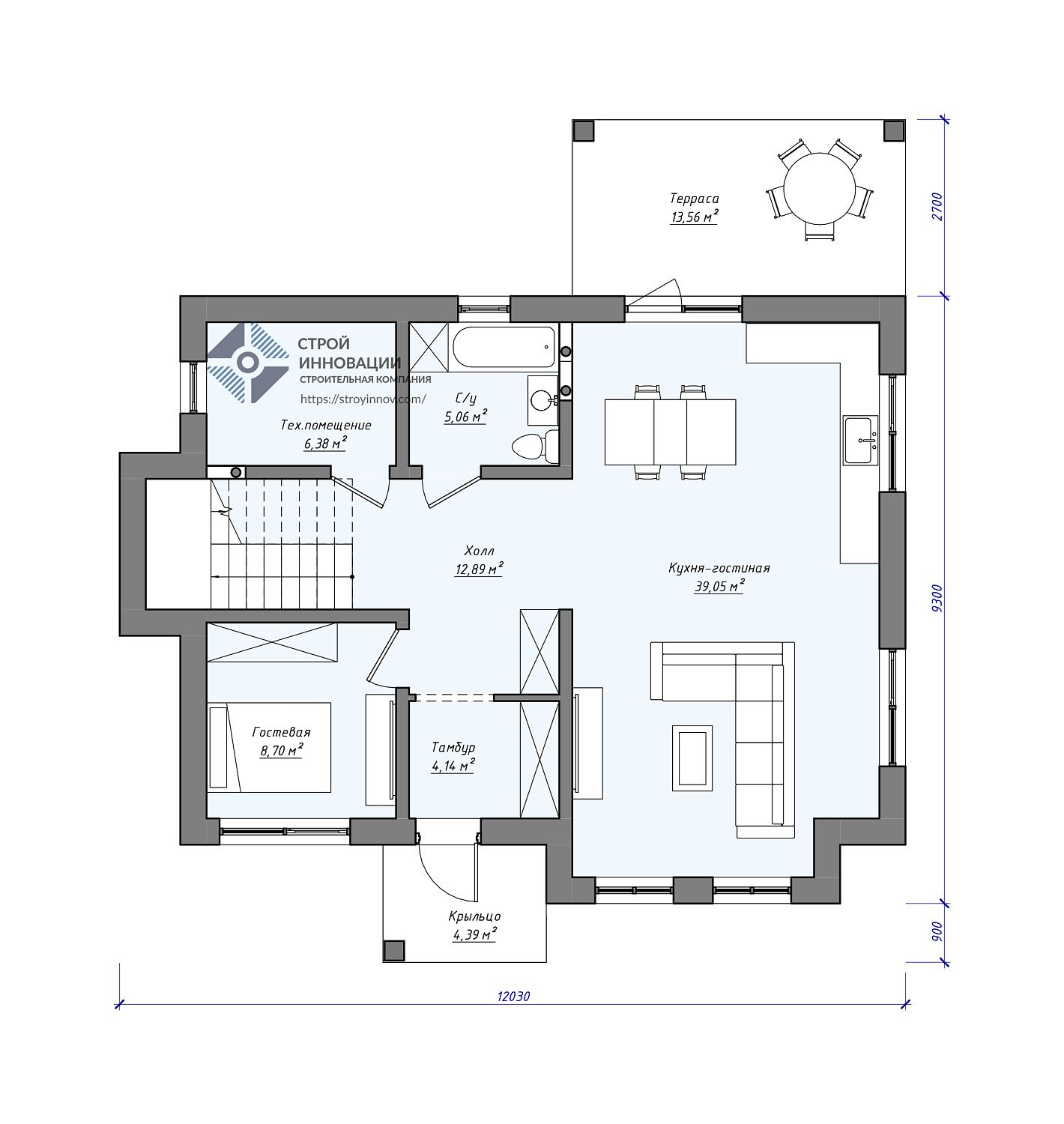 - Габариты дома - 12,3 х 12 м