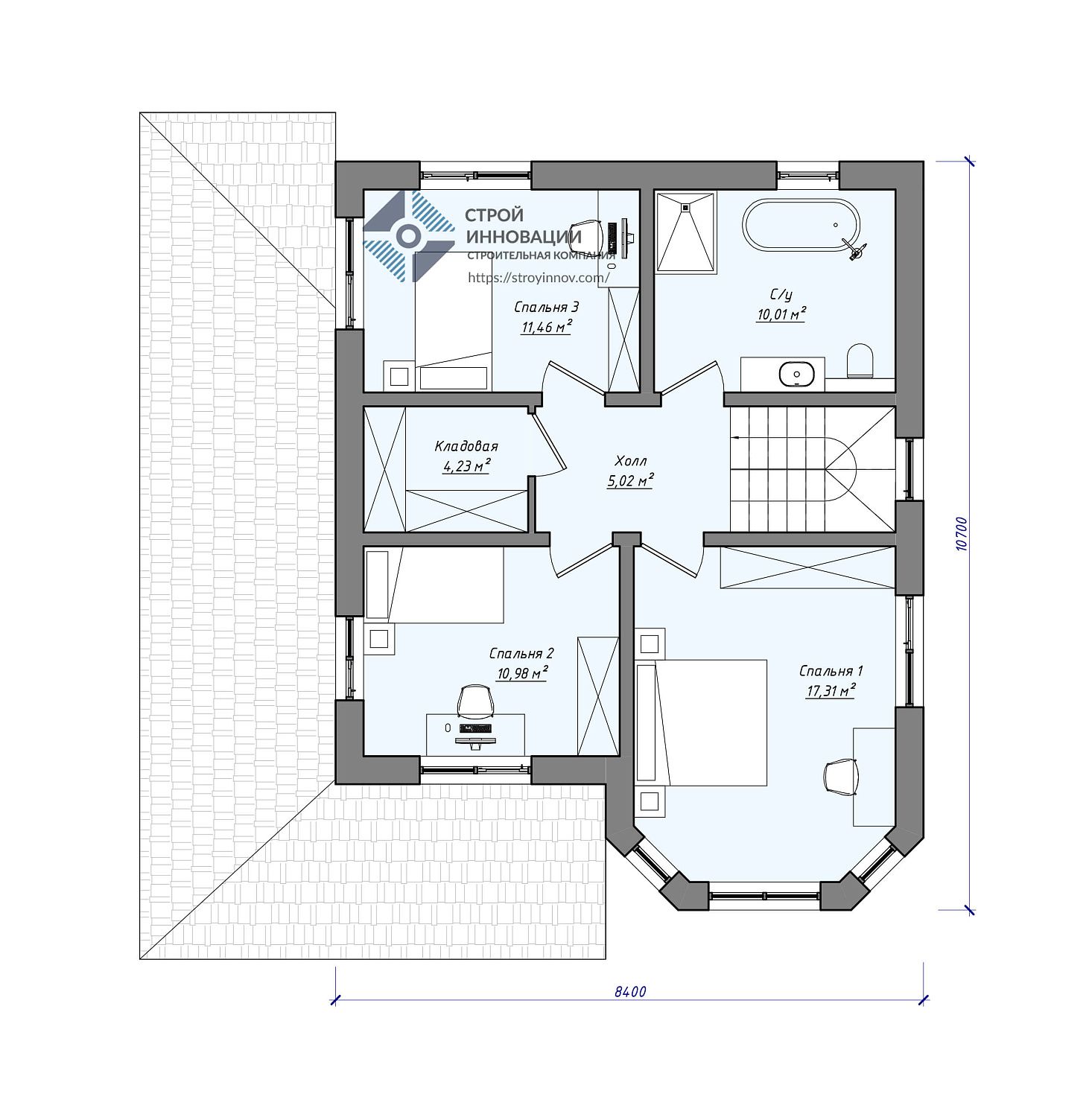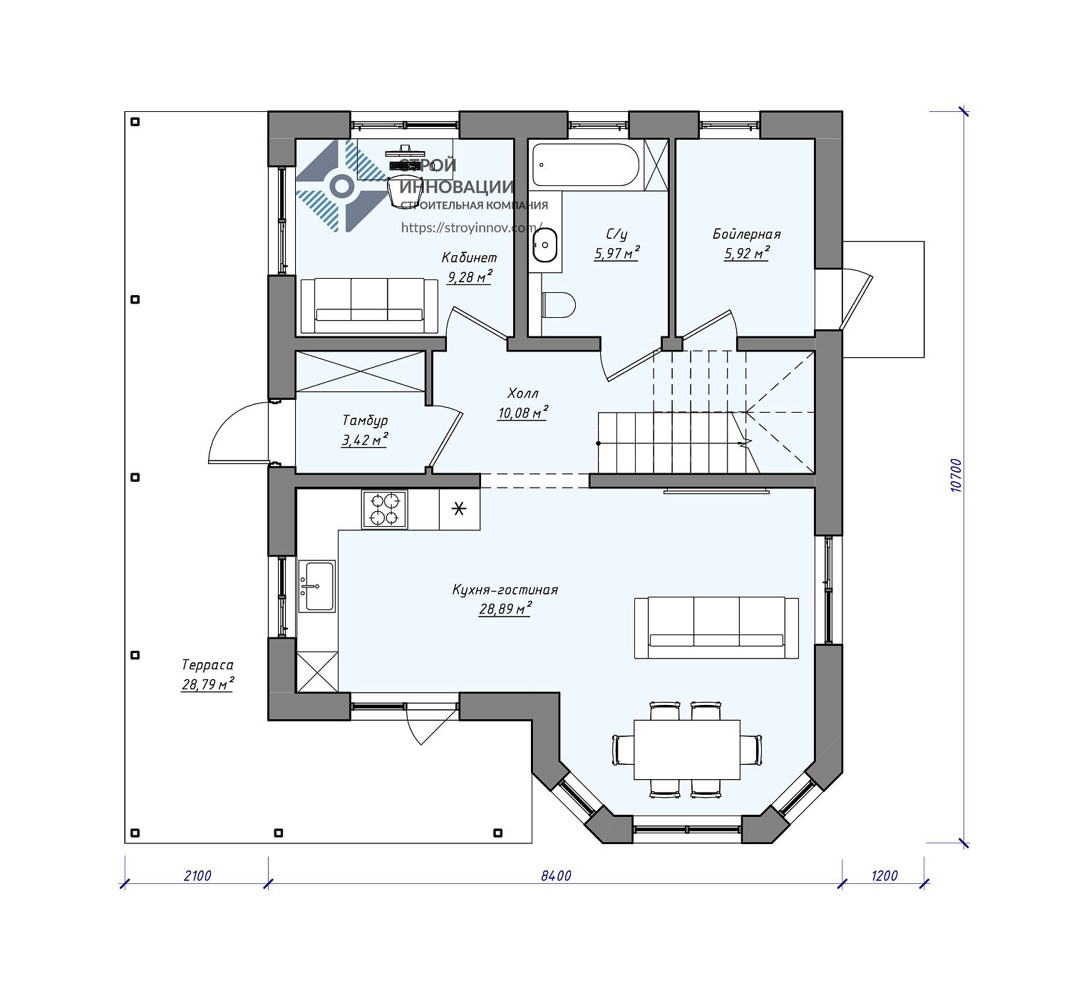 - Габариты дома - 11,7 х 10,7 м