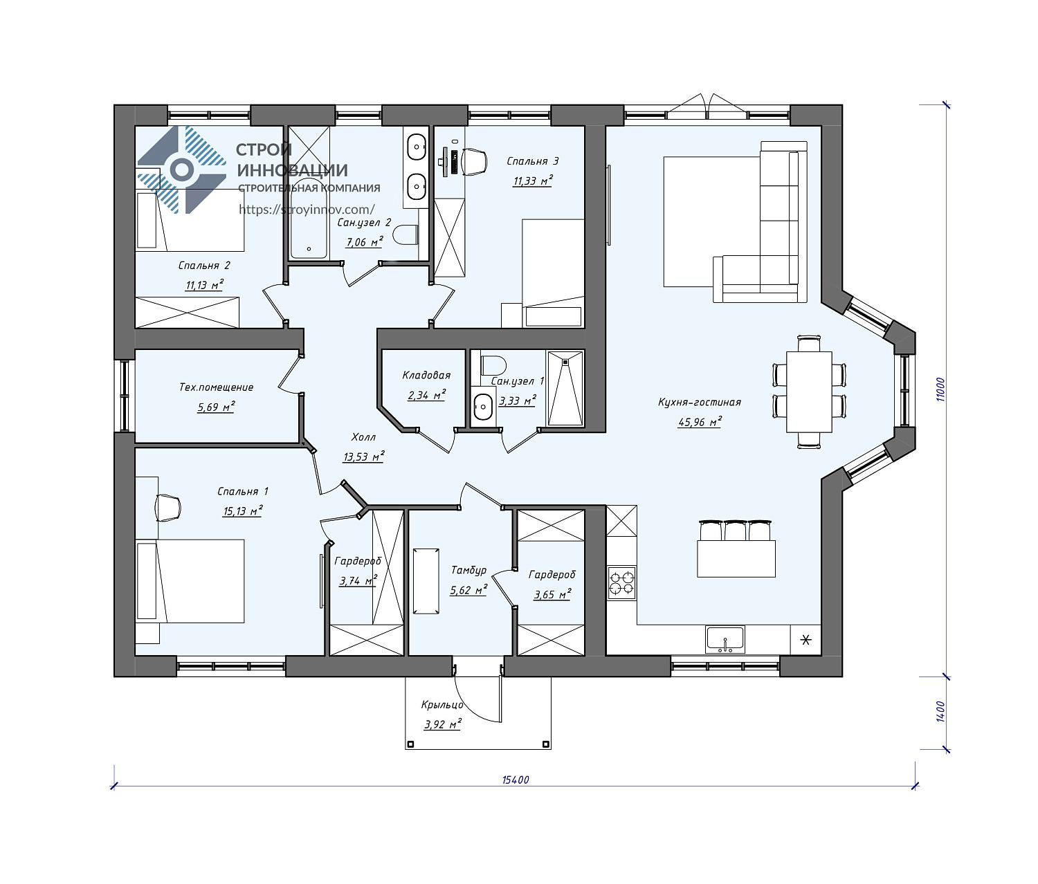 - Габариты дома - 15,4 х 11,4 м