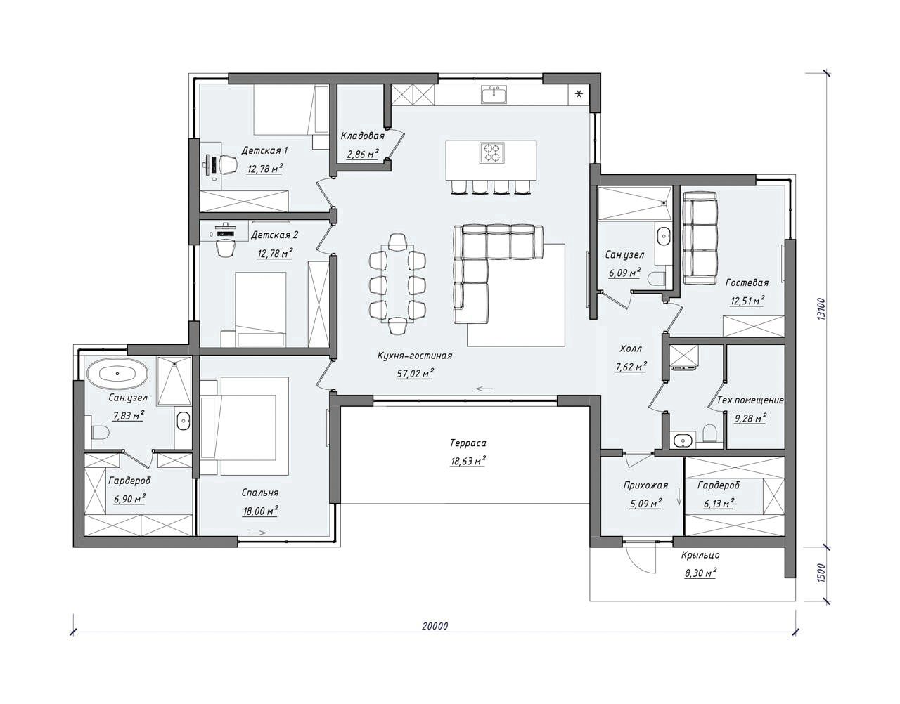- Габариты дома - 20 х 14,6 м